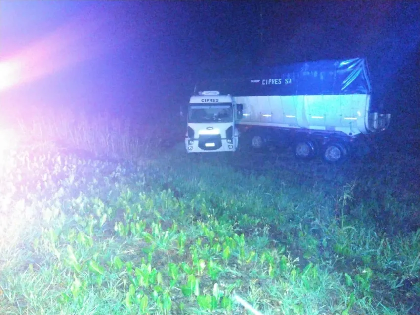 A su arribo constataron que un camión Ford 290 con acoplado perteneciente a la empresa Transporte Chipres S.A. conducido por un hombre de 49 años perdió el control, despistó y terminó en la banquina.