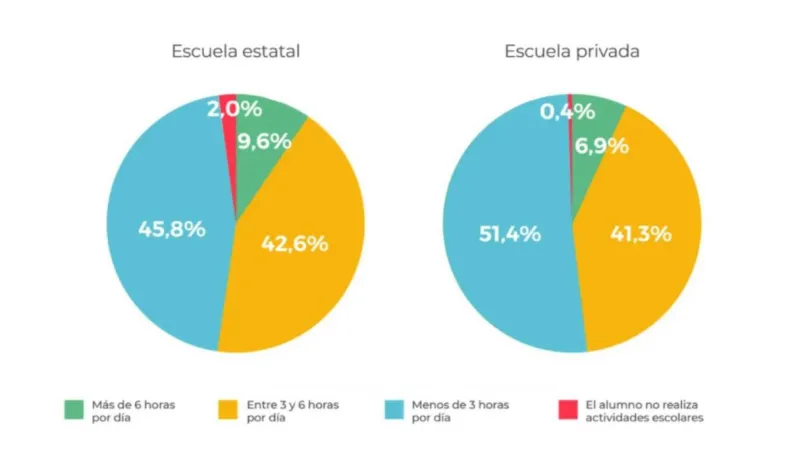 Los resultados de la encuesta, que respondieron familias de 253 colegios primarios, muestran que, tanto en las instituciones estatales como en las privadas, la mitad de los alumnos destina más de tres horas por día a actividades escolares. La mayoría de los estudiantes asegura que recibe devoluciones de las actividades que realiza por parte de sus docentes: son el 66,8% de los que asisten a escuelas privadas y el 61,4% de los que van a estatales.