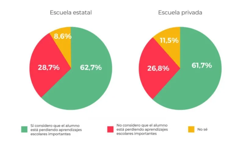 El informe detalla, además, que seis de cada 10 familias consideran que los alumnos están perdiendo aprendizajes. A la vez, tres de cada cuatro encuestados valoran positivamente el trabajo de los docentes: el 75,2% está conforme con los maestros en el sector privado, mientras que la cifra es del 71,6% en el sector estatal.