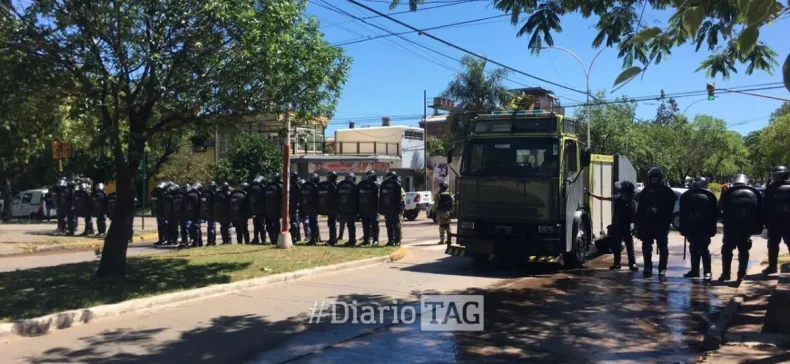 En la avenida San Martín, el cordón policial impidió que los manifestantes encabezados por el presidente de Libres del Sur, Carlos Martínez, avancen hacia la calle Ameghino, junto con el camión hidrante, y arrojaron gas pimienta para intentar dispersar a estas personas.