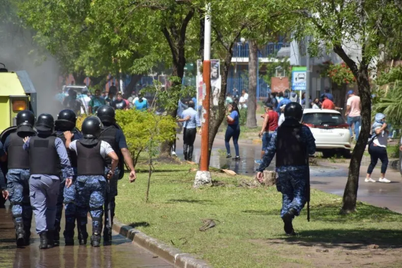 El movimiento social Barrios de Pie se concentró en la plaza España de Resistencia con la intención de marchar hacia la Casa de Gobierno a favor de la ley del impuesto a la riqueza pero la situación se tornó violenta cuando la Policía intentó desarmar la movilización.