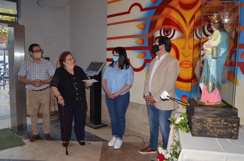 Gustavo Martínez agradeció a la comunidad María Auxiliadora en general y a Carmen Ramírez en particular por "tener la gentileza de visitar las instalaciones de la Municipalidad por una semana, en este tránsito que recorre María Auxiliadora en el mes de la Virgen".