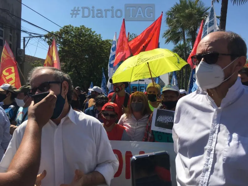 El diputado Rodolfo Schwartz del Partido Del Trabajo Y Del Pueblo y el ex legislador Carlos Martínez de Libres del Sur participan de la movilización que pretende llegar a la plaza central de Resistencia para encabezar un acto.