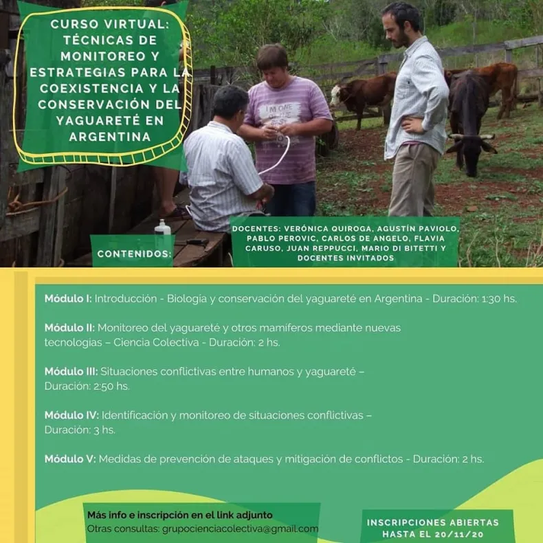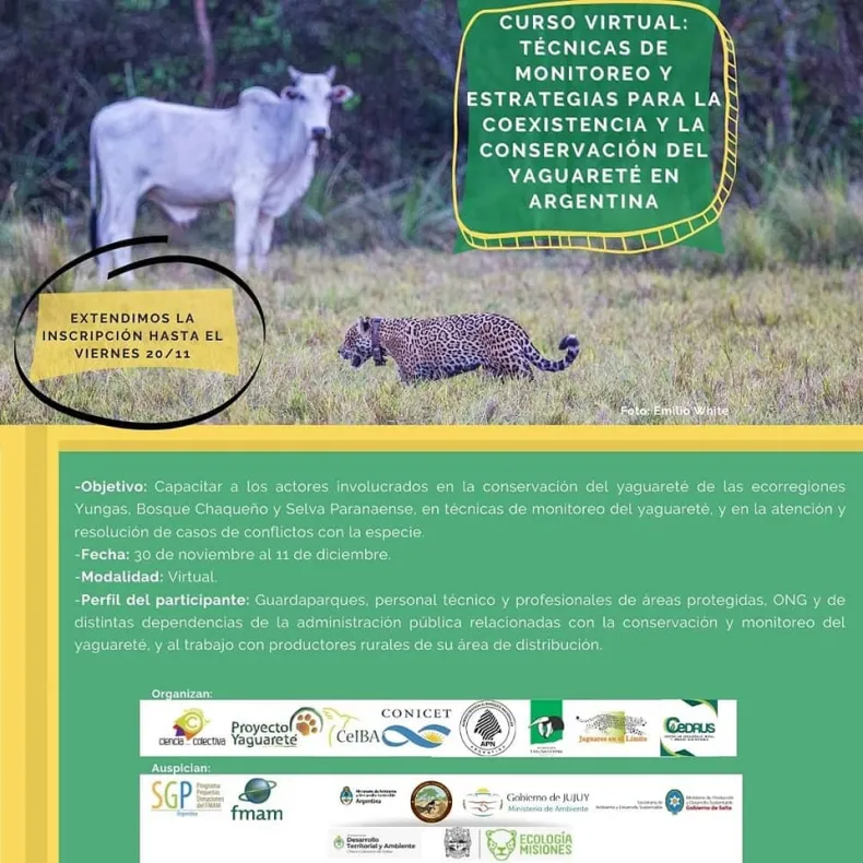 Desde la cuenta de Facebook de la ONG "Proyecto Yaguareté" se informó que se extendió el plazo de la inscripción del curso virtual, hasta el viernes 20 de noviembre inclusive, completando un formulario en este enlace.