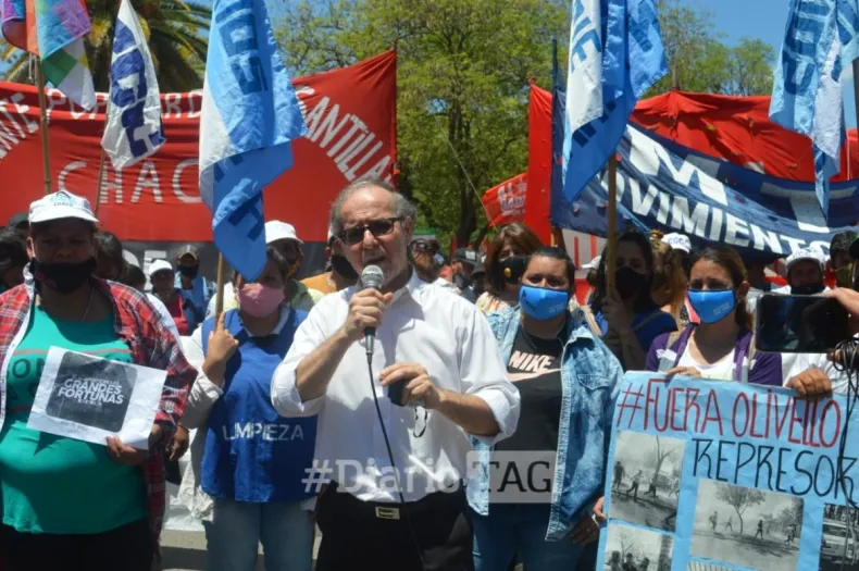 En otro momento de su discurso, el dirigente contó el cruce previo que tuvo con el subsecretario de Prevención y Seguridad en Abordaje Territorial a quien le cuestionó la "distinta vara" en otras movilizaciones. "Acá lo sectores reaccionarios no tienen motivos para marchar, desde Vicentin hasta piden la renuncia del presidente, pueden andar sin barbijo y como se les ocurra", expresó.