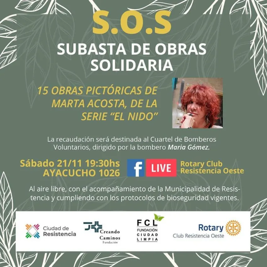 Este sábado 21 de Noviembre desde las 19:30 hs en Ayacucho 1026 de la ciudad de Resistencia, se llevará a cabo la subasta de obras solidarias para recaudar fondos y apoyar la tarea de los Bomberos Voluntarios San Fernando que dirige Maria Gomez, quien recientemente fuera reconocida por Ciudad Limpia y la comunidad con el Premio "Honrar la Vida 2020" .