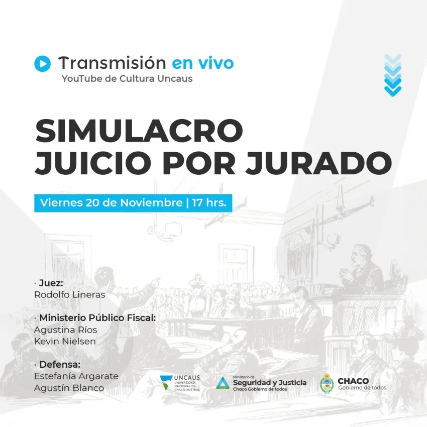 El Ministerio de Seguridad y Justicia realizará este viernes, desde las 17 en la sede de UNCAus de Presidencia Roque Sáenz Peña, el primer simulacro de juicio penal por jurado, con la participación del juez Rodolfo Lineras y los 18 miembros del jurado que fueran sorteados tras la convocatoria abierta. La iniciativa es promovida con la colaboración del Ministerio de Desarrollo Social, la universidad y el Ministerio Público Fiscal.