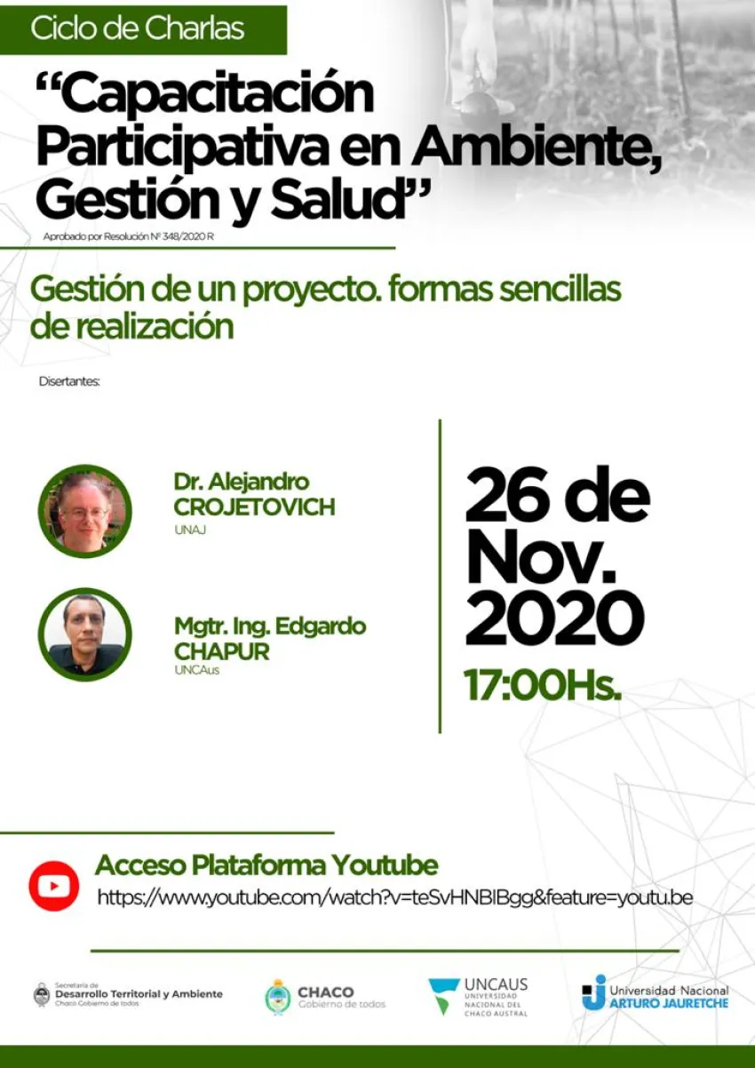 La charla virtual se realizará el día 26 de noviembre, a las 17 horas. La misma se realiza en el marco del Ciclo de Charlas: "Capacitación Participativa en Ambiente, Gestión y Salud", organizadas por la Universidad Nacional del Chaco Austral (UNCAus), junto a la Universidad Nacional de Arturo Jauretche (UNAJ) y la Secretaría de Desarrollo Territorial y Ambiente del Gobierno de la provincia de Chaco.