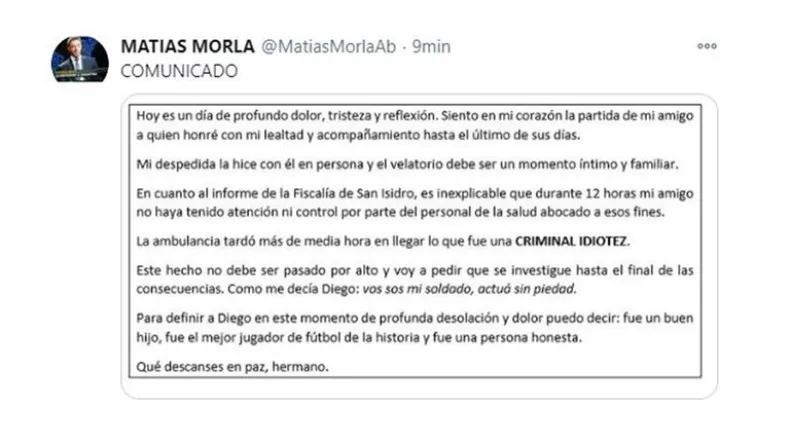 "Nos veremos pronto, amigo. Hasta siempre Comandante. Te voy a extrañar", escribió Matías Morla en su cuenta de Twitter luego de que se conociera la fatal noticia de la muerte de Diego Maradona. Recién casi 24 horas después el abogado volvió a referirse públicamente al fallecimiento del astro deportivo, también a través de las redes sociales.