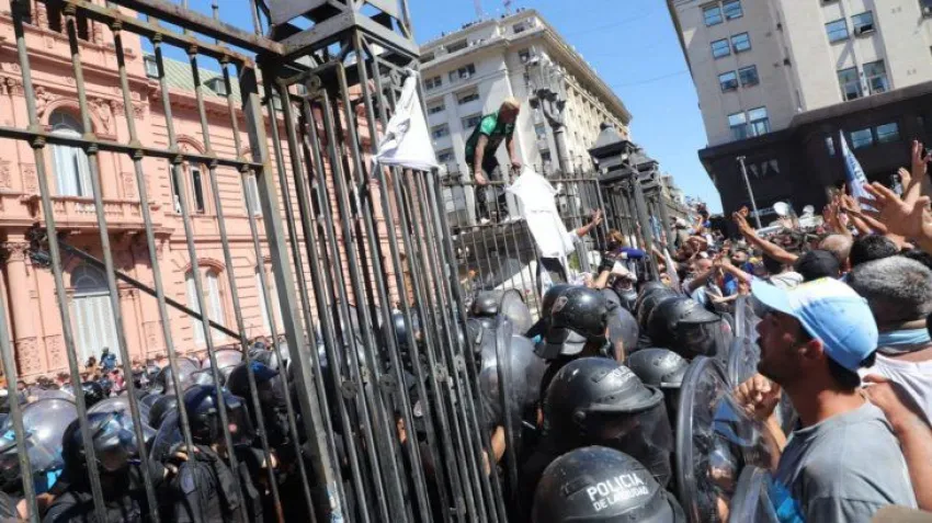 El operativo de seguridad en el ingreso a la Casa Rosada para el velatorio de Diego Maradona se desbordó esta tarde cuando cientos de fanáticos empezaron a trepar las rejas del edificio gubernamental.