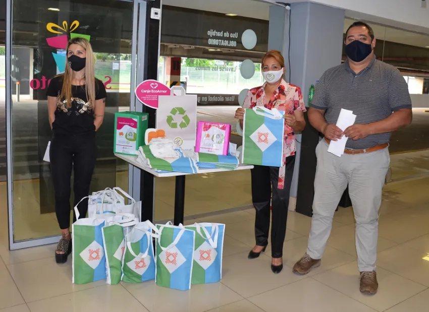 El Municipio junto a fundaciones, entregaron bolsas reutilizables y kits sanitizantes en el Shopping