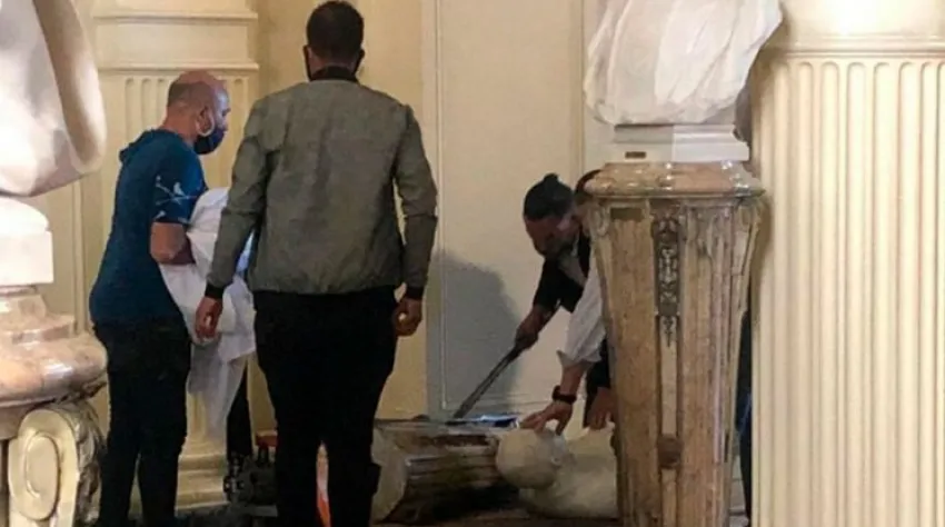 Durante esos minutos de caos, en que la seguridad de la Casa de Gobierno se vio sobrepasada, cientos de personas se agolparon frente al cajón de Maradona y luego pasaron al Patio de las Palmeras. Durante ese corto pero caótico tiempo, los empujones y las corridas generaron que el busto del ex presidente Hipólito Yrigoyen se cayera al piso y sufriera algunos daños.