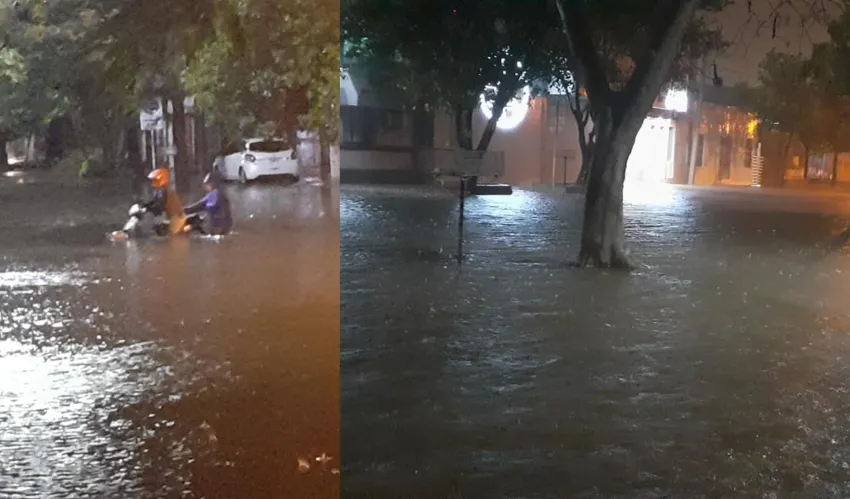 En redes sociales, el usuario Daniel Estigarribia compartió fotografías de la esquina de Monteagudo e Hipólito Yrigoyen, en la esquina de la Municipalidad donde el agua colapsó la zona.