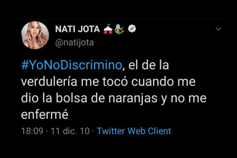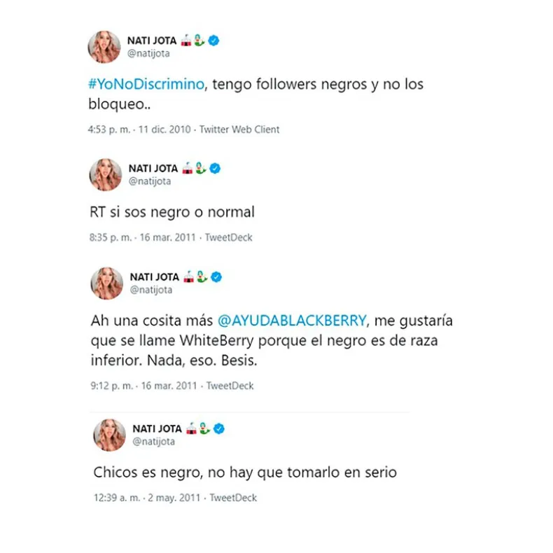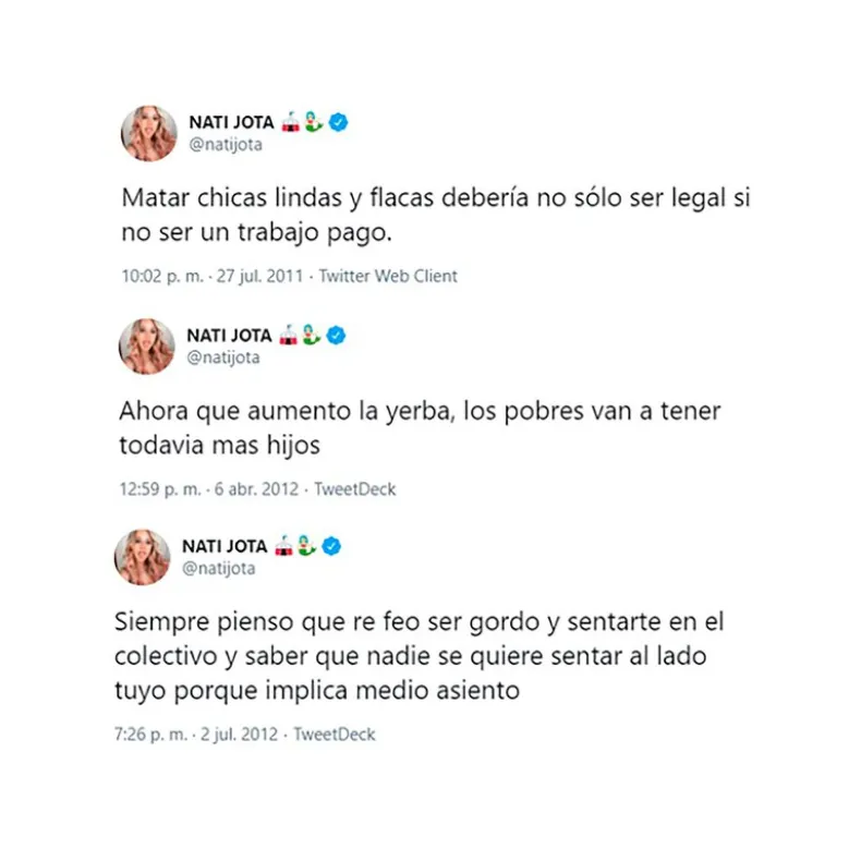"Amanecí como el c... porque de repente me están matando por tuits viejos". Nati Jota publicó este martes por la mañana un video en el que hace referencia a lo que sucedió durante la madrugada cuando distintos usuarios encontraron polémicos mensajes racistas y discriminatorios que la periodista escribió hace 10 años, cuando recién comenzaba en Twitter.