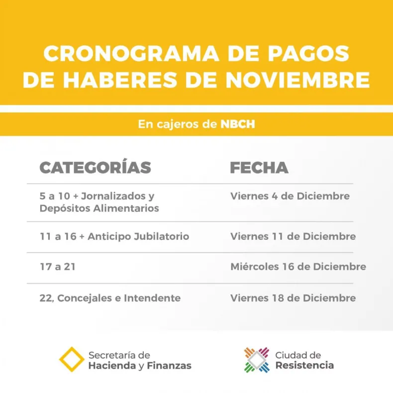 La Secretaría de Hacienda y Finanzas del Municipio de Resistencia informó que este viernes 4 de diciembre inicia el cronograma de pagos de haberes de noviembre, jornada en la que cobrarán jornalizados y agentes municipales comprendidos en las categorías 5 a la 10, y se incluyen los depósitos alimentarios.