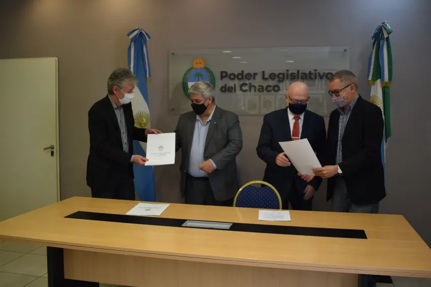El acto, llevado a cabo en la sala de Labor Parlamentaria, contó con la presencia del presidente del Poder Legislativo, Hugo Sager, y el autor de la Resolución 388/20, Juan Manuel Pedrini; quienes hicieron entrega de las carpetas protocolares a los Dres. Díaz y García, y a los hijos de los Dres. Echevarría y Parras.