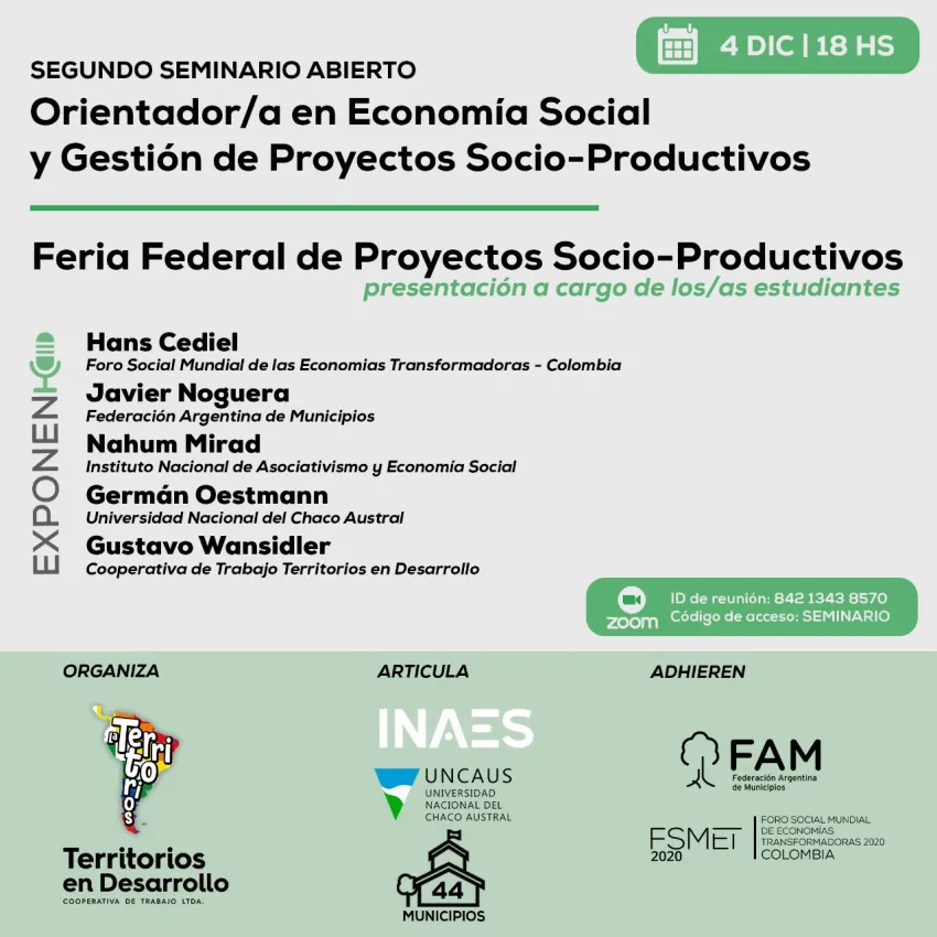 La Universidad Nacional del Chaco Austral (UNCAus) invita a participar del Segundo Seminario Abierto de Orientador/a en Economía Social y Gestión de Proyectos Socioproductivos, que se realizará el día viernes 4 de diciembre de 2020, a las 18, por plataforma zoom.