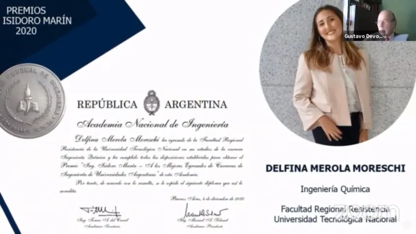 El pasado viernes, en un acto virtual, la Academia Nacional de Ingeniería de la República Argentina entregó los premios "Ing. Isidoro Marín" a egresados y egresadas sobresalientes de las diversas carreras de esta disciplina que se dictan en universidades de nuestro país. Allí, recibió su reconocimiento Delfina Merola Moreschi, ingeniera química egresada de la Facultad Regional Resistencia de la Universidad Tecnológica Nacional.