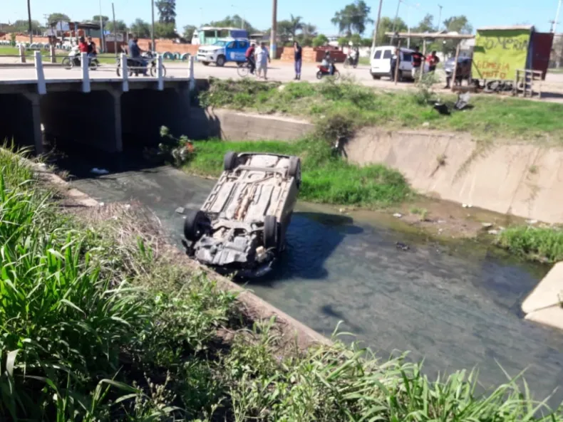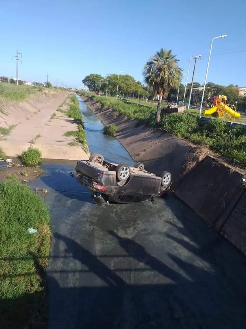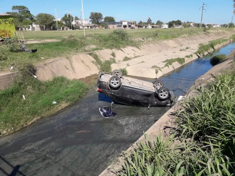 Esta mañana, alrededor de las 8.30 horas, en la intersección de las avenidas Malvinas Argentinas y Alberdi se produjo un accidente de tránsito que terminó con un auto volcado en un canal.