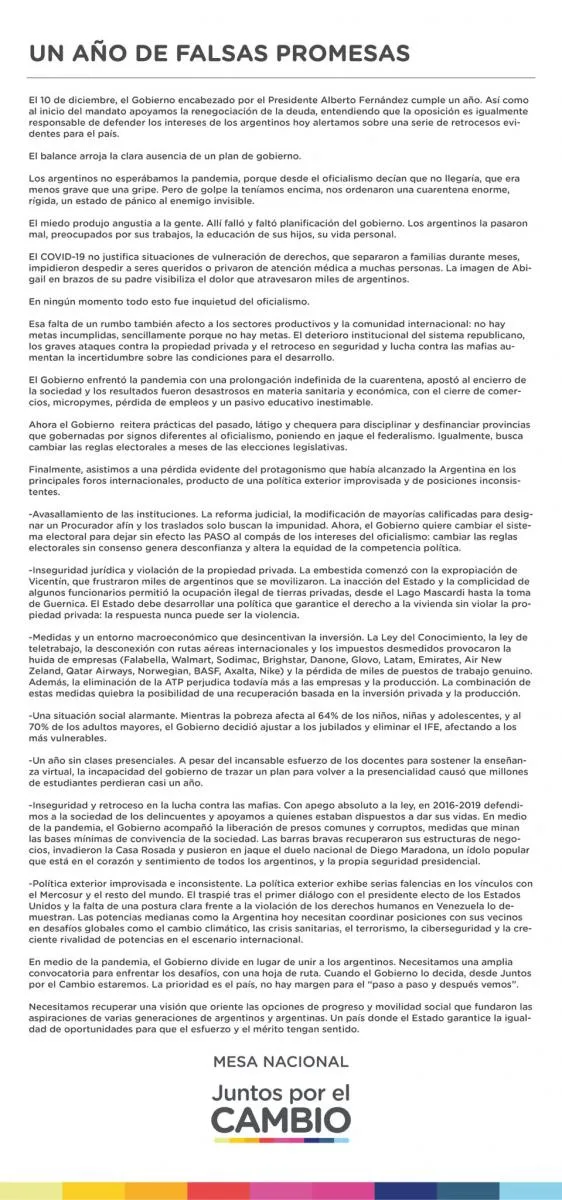 Según Infobae, dos días antes de que el gobierno de Alberto Fernández cumpla su primer año, Juntos por el Cambio difundió un duro comunicado en el que criticaron "el avasallamiento de las instituciones" y la ausencia de planificación tanto económica como sanitarias.