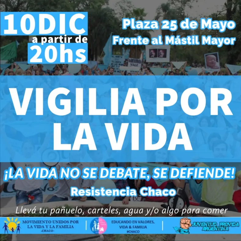 Bajo el lema "La vida no se debate, se defiende", invitaron a acercarse a realizar la vigía mientras a nivel nacional se debate en Diputado por la interrupción legal del embarazoy solicitaron que quienes se acerquen llevensus pañuelos, carteles, agua y/o algo para comer.