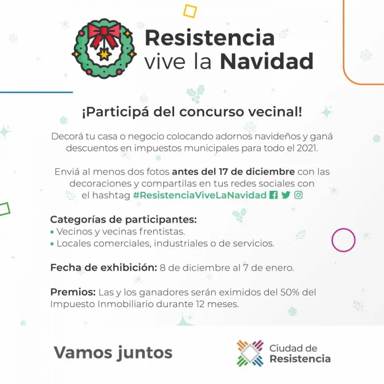 El Municipio lanzó el Concurso "Resistencia vive la Navidad", que tiene por objetivo incentivar el espíritu en esta época del año tan especial, y fue creado a partir de la aprobación de la ordenanza N° 13.414. Quienes quieran participar deberán decorar con motivos navideños el frente de sus casas, locales comerciales, industriales o de servicios, y la ornamentación deberá permanecer desde el 8 de diciembre hasta el 7 de enero del siguiente año.