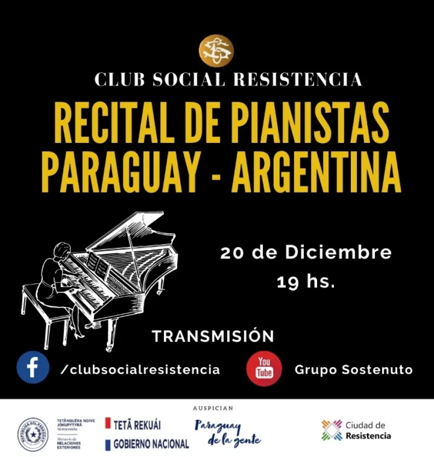 Desde el Club Social de Resistencia, invitan a participar del Recital de Pianistas "Paraguay-Argentina" que se realizará el próximo domingo 20 de diciembre desde las 19:00 a través de Facebook Live del Club Social.