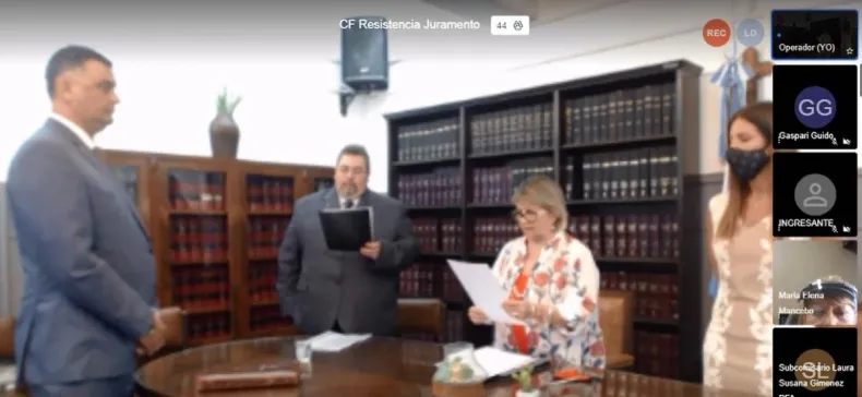 Este martes a las 11 horas, desde el Salón de Acuerdos de la Cámara Federal de Apelaciones de Resistencia, la Presidenta del Tribunal, Dra. María Delfina Denogens junto con la Vicepresidenta, Dra. Rocío Alcalá, dieron la bienvenida al público que se dio cita en forma presencial y virtual para compartir este importante momento para la Justicia Federal de esta jurisdicción, en el marco del Acto de Jura de posesión de cargo del titular del Juzgado Federal de Primera Instancia Nº 2 de Resistencia, Dr. Ricardo Alcides Mianovich.