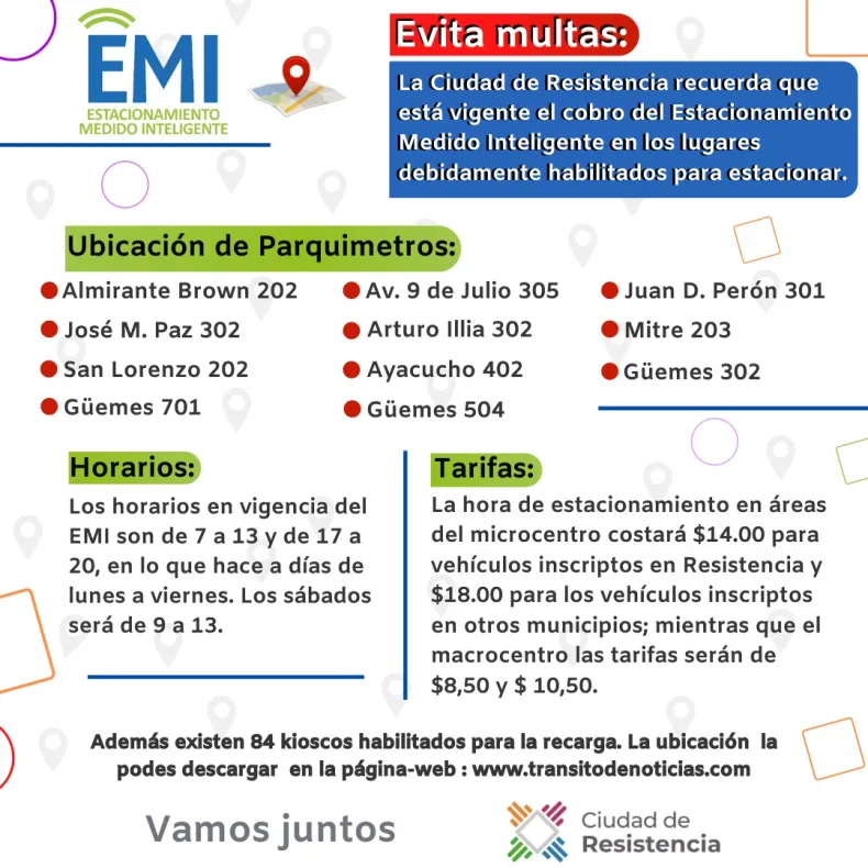 La Municipalidad de Resistencia, a través de Secretaría de Gobierno y la Subsecretaria de Transito y Seguridad Ciudadana, recuerda a los vecinos sobre el cumplimento del sistema de Estacionamiento Medido Inteligente (EMI) para evitar multas contravencionales.
