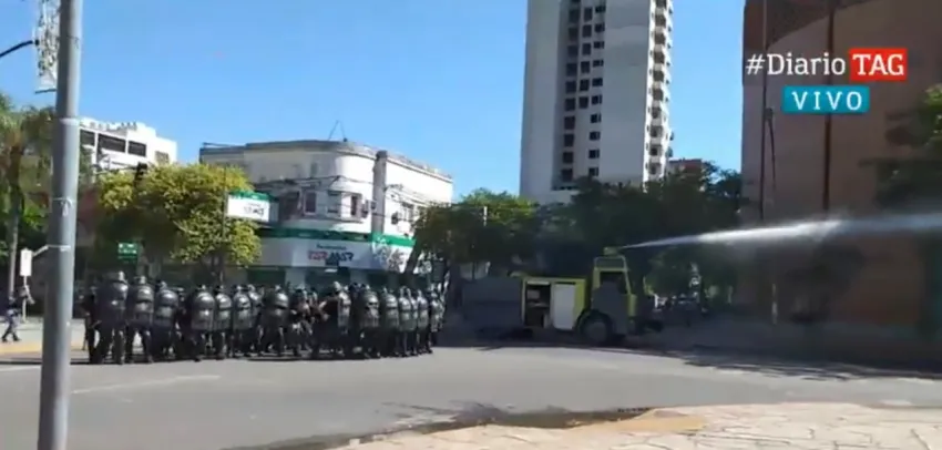 Allí, la Policía realizó un cordón para evitar el avance de los manifestantes, quienes sin mediar palabra, comenzaron a arrojar cascotes a los efectivos que custodiaban el edificio.