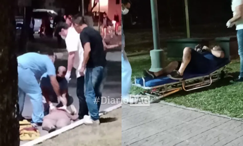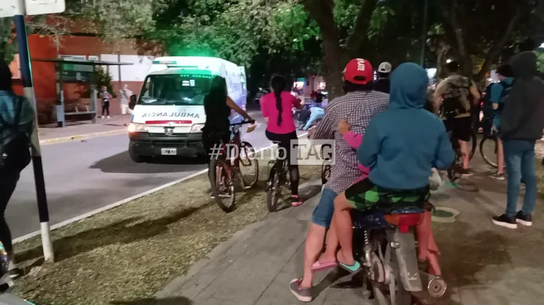 En un video y varias fotos se puede ver al personal médico que llegó en una ambulancia auxiliando a la mujer que se encontraba al lado del cordón de la avenida y al motociclista que estaba en la vereda.