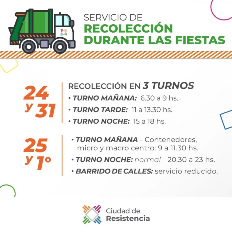 El Municipio de Resistencia comunica a todos sus vecinos que el servicio de recolección domiciliaria de residuos previsto para el jueves 24 de diciembre será de la siguiente manera: el turno mañana, de 6:30 a 9; el turno tarde, de 11 a 13.30; y el turno noche, de 15 a 18 horas.