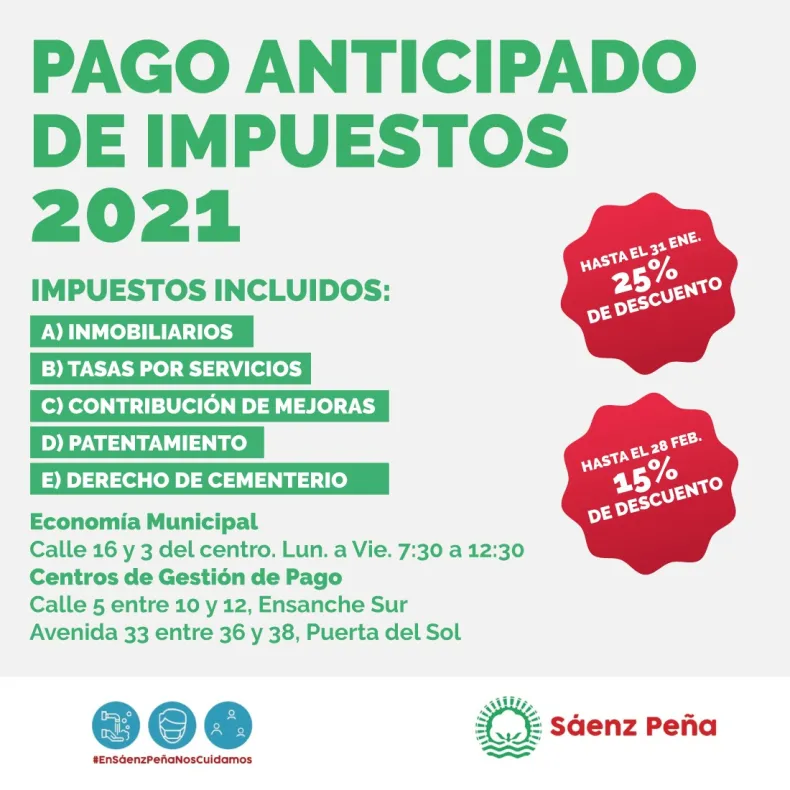 Hasta el 31 de enero inclusive, el Municipio de Sáenz Peña ofrece hasta el 25% de descuento en el pago anticipado de impuestos 2021. En tanto que aquellos que abonen luego de esa fecha accederán a un 15% de descuento hasta el 28 de febrero.