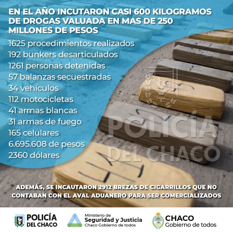 Además, secuestraron 57 balanzas, 34 vehículos, 112 motocicletas, 41 armas blancas, 31 armas de fuego, 165 celulares, $6.695.608 y 2360 dólares. También se logró incautar 2912 brezas de cigarrillos que no contaban con el aval aduanero para ser comercializados en la provincia, algo que incrementó