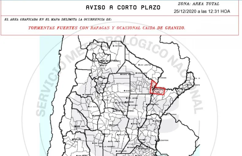 El cielo está mayormente nublado con tormenta sin precipitación, aunque se espera la irrupción de una fuerte tormenta con ráfagas de viento y ocasional caída de granizo. El Servicio Meteorológico Nacional emitió una alerta meteorológica para los departamentos de Gral Donovan, 1 de Mayo, Bermejo, Ldor Gral S. Martin, Libertad y San Fernando.