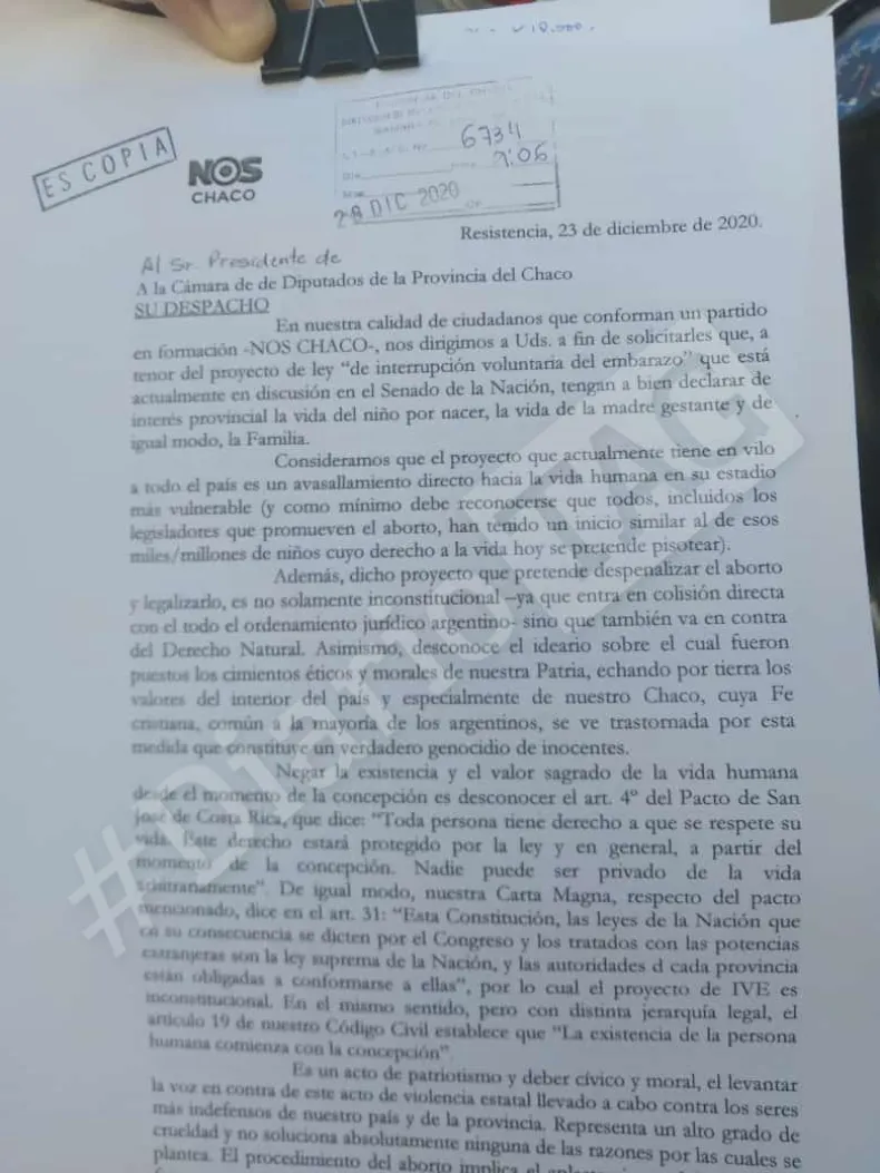Se trata de un proyecto del partido en formación NOS CHACO que, a través de su presidente Dario Cañete, se presentó en la Cámara de Diputados de la provincia a fin de "declarar de interés provincial la vida del niño por nacer, la vida de la madre gestante y de igual modo, de la familia".