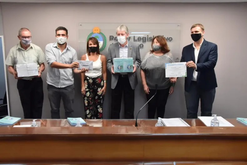 El presidente del Poder Legislativo, Hugo Sager, junto a los legisladores Gladis Cristaldo y Juan Manuel Pedrini, la titular del Instituto de Cultura de la provincia Mariela Quirós, y a Rubén Duk de la Librería y Editorial Contexto, entregaron los premios a los seis ganadores que tuvo el concurso literario anual de la Legislatura en su quinta edición.