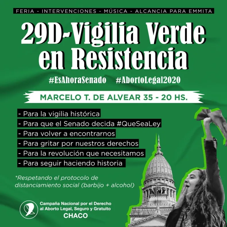 "Para la vigilia histórica, para que el Senado decida #QueSeaLey, para volver a encontrarnos, para gritar por nuestros derechos, para la revolución que necesitamos, para seguir haciendo historia", indicó la Campaña Nacional por el Derecho al Aborto Legal, Seguro y Gratuito Chaco y pidió respetar el protocolo de distanciamiento social, barbijo y alcohol.