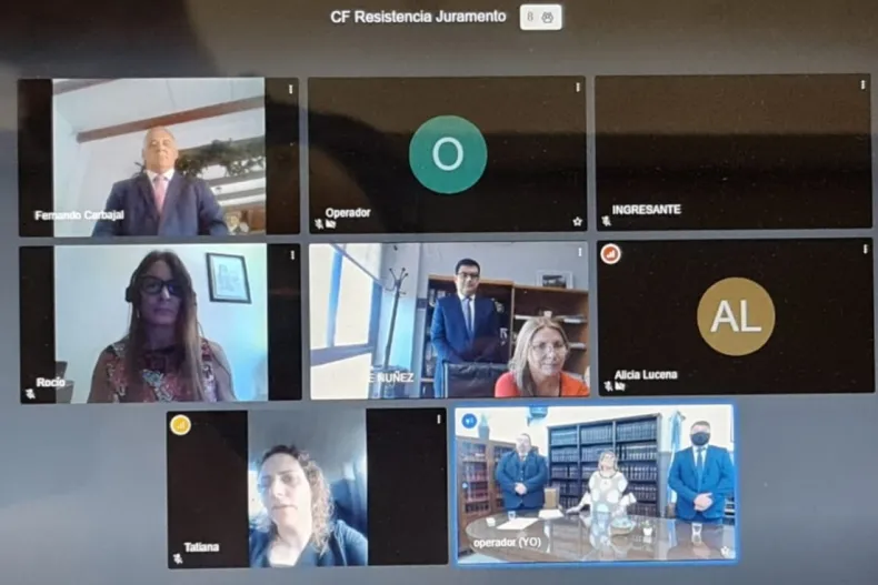Las autoridades dieron la bienvenida a los presentes que se dieron cita a través de la plataforma electrónica del Poder Judicial de la Nación, en el marco del Acto de Jura de posesión de cargo del doctor Fernando Carbajal como Juez subrogante del Juzgado Federal de Primera Instancia de Presidencia Roque Sáenz Peña, función que venía desempeñando hasta ese momento el doctor Miguel Mariano Aranda.
