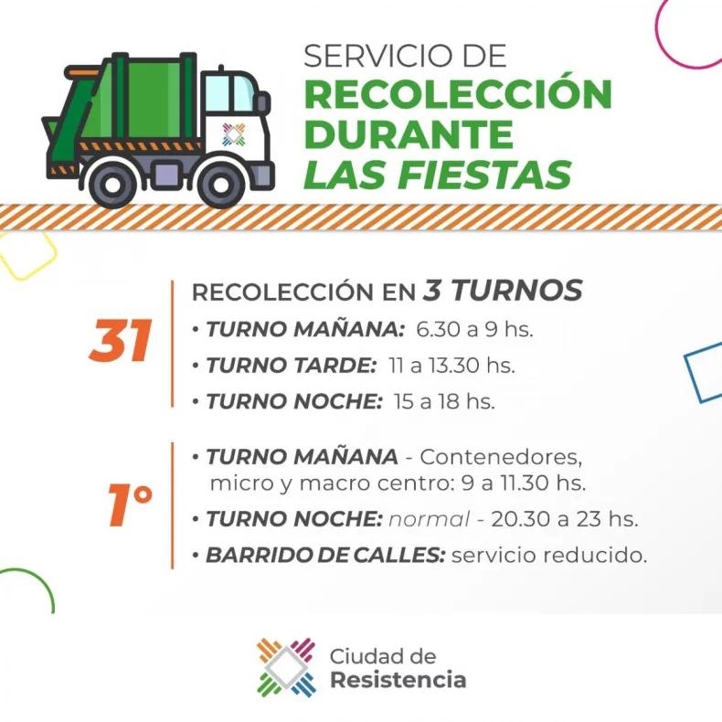 La Municipalidad de Resistencia, a través de la Secretaría de Servicios Públicos, dio a conocer los horarios de recolección de residuos para este jueves 31 de diciembre y el viernes 1 de enero.