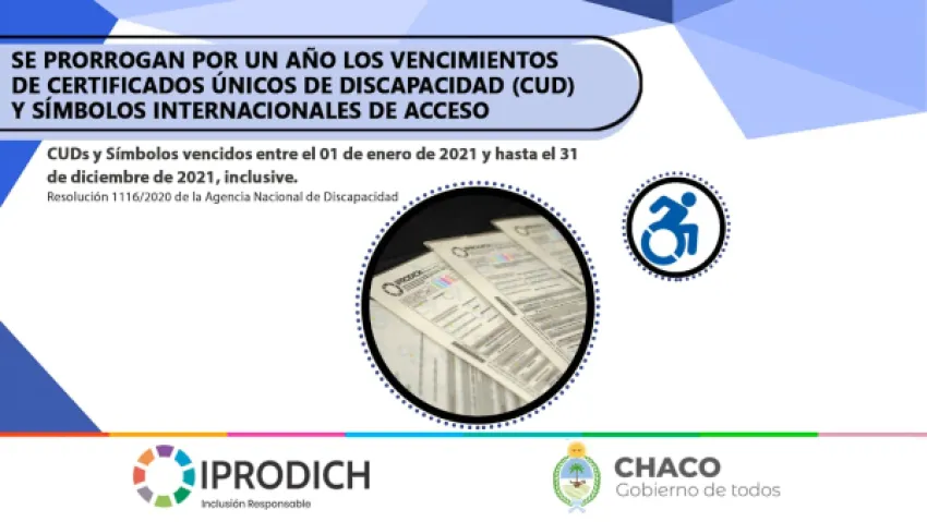 El Instituto Provincial para la Inclusión de las Personas con Discapacidad del Chaco (IPRODICH) informa a los chaqueños y chaqueñas con discapacidad que se prorrogan por un año los vencimientos de Certificados Únicos de Discapacidad (CUDs) y Símbolos Internacionales de Acceso.