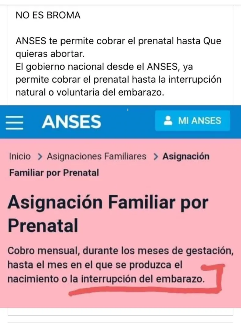 Con la reciente aprobación de la Interrupción Voluntaria del Embarazo (IVE), en redes sociales comenzó a circular una desinformación malintencionada en la que aseguran que "te permiten cobrar el prenatal hasta que quieras abortar". A la redacción de Diario TAG llegaron diversas capturas sobre el tema, pero se trata de una noticia falsa.
