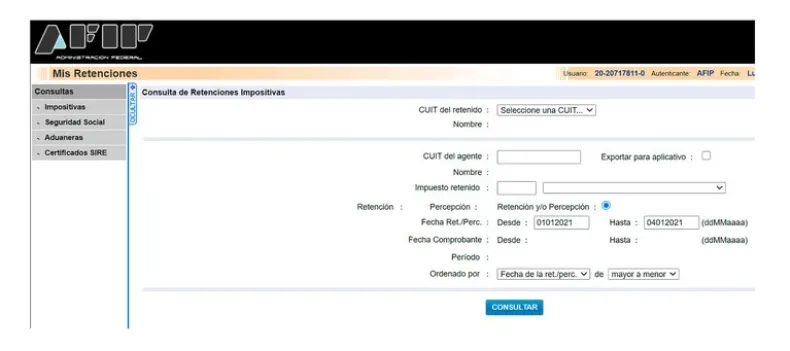 El paso siguiente es llenar unos campos con los datos personales del contribuyente y elegir la retención a consultar. Allí se deberá optar por la percepción del tributo asociado al "impuesto PAIS" y luego seleccionar el intervalo de fechas.