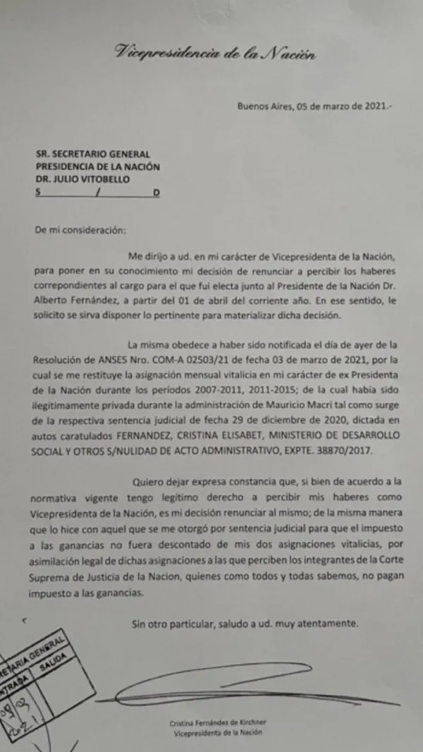 "Me dirijo a usted en mi carácter de Vicepresidenta de la Nación, para poner en su conocimiento mi decisión de renunciar a percibir los haberes correspondientes al cargo para el que fui electa junto al Presidente de la Nación Alberto Fernández, a partir del 01 de abril del corriente año. En ese sentido, le solicito se sirva disponer lo pertinente para materializar dicha decisión", afirmó Cristina Kirchner en el comienzo del texto que dio a conocer este miércoles.