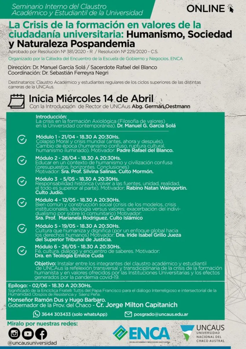 El seminario, que se encuentra aprobado por Resolución N° 381/2020- R. y Resolución N° 229/2020- C.S. de la Universidad, es organizado por la Cátedra del Encuentro de la Escuela de Gobierno y Negocios (ENCA) y la Universidad Nacional del Chaco Austral.