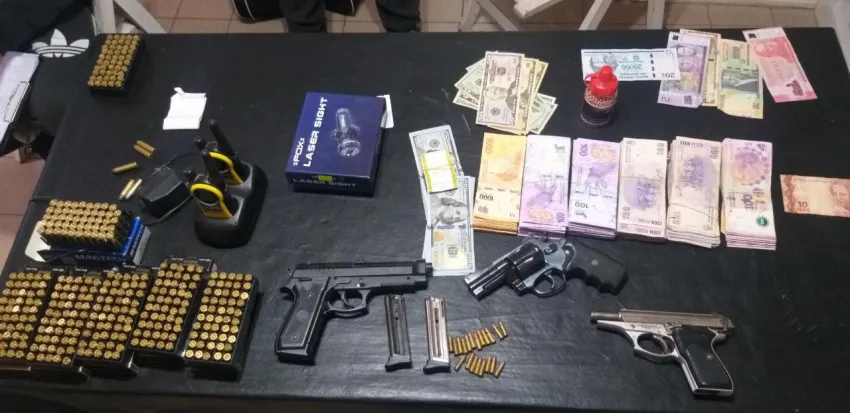 Con una orden del Juzgado de Garantías N°2, los policías allanaron una casa en la que detuvieron al dueño y secuestraron una pistola calibre 22, una pistola calibre 380, un revólver calibre 357, una pistola de aire comprimido y sus municiones, u$s11.300, $146.200, 24.000 guaraníes, dos radios handy y 474 cartuchos de distintos calibres.