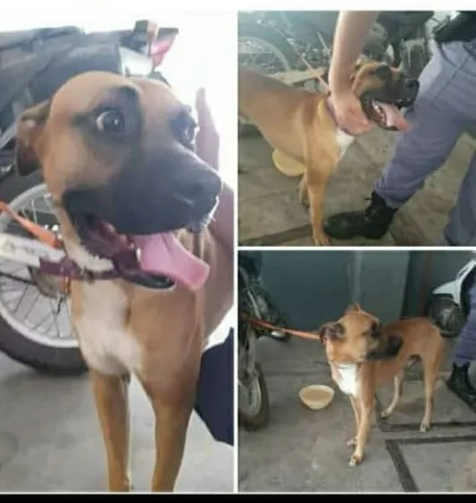 Ayer en la siesta, los agentes de la Comisaría Segunda notaron a un perro asustado sobre la vereda de la avenida 25 de Mayo al 1100. Se trata de un bóxer macho, color marrón con un collar morado y sin identificación.