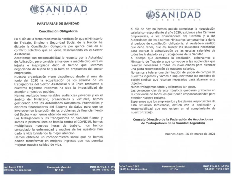 Luego del inicio de los reclamos del personal médico de la salud privada, que comenzaran la semana pasada con asambleas en los lugares de trabajo, paro de tres horas por turnos y finalmente un paro total programado para este martes 30 de marzo, la conciliación obligatoria del Gobierno hizo a suspender los planes.