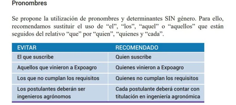 También, propone usar pronombres "sin género" con varios ejemplos. Sugiere reemplazar "el que suscribe" por "quien suscribe". También "los postulantes deberán ser ingenieros agrónomos" por "cada postulante deberá contar con titulación en ingeniería económica".