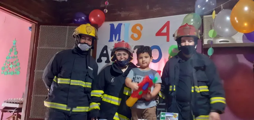 Durante la mañana de hoy, un niño de 4 años que festejaba su cumpleaños fue sorprendido por personal de la División Bomberos de la Policía, con quienes compartió un grato momento e hicieron entrega de algunos regalos.